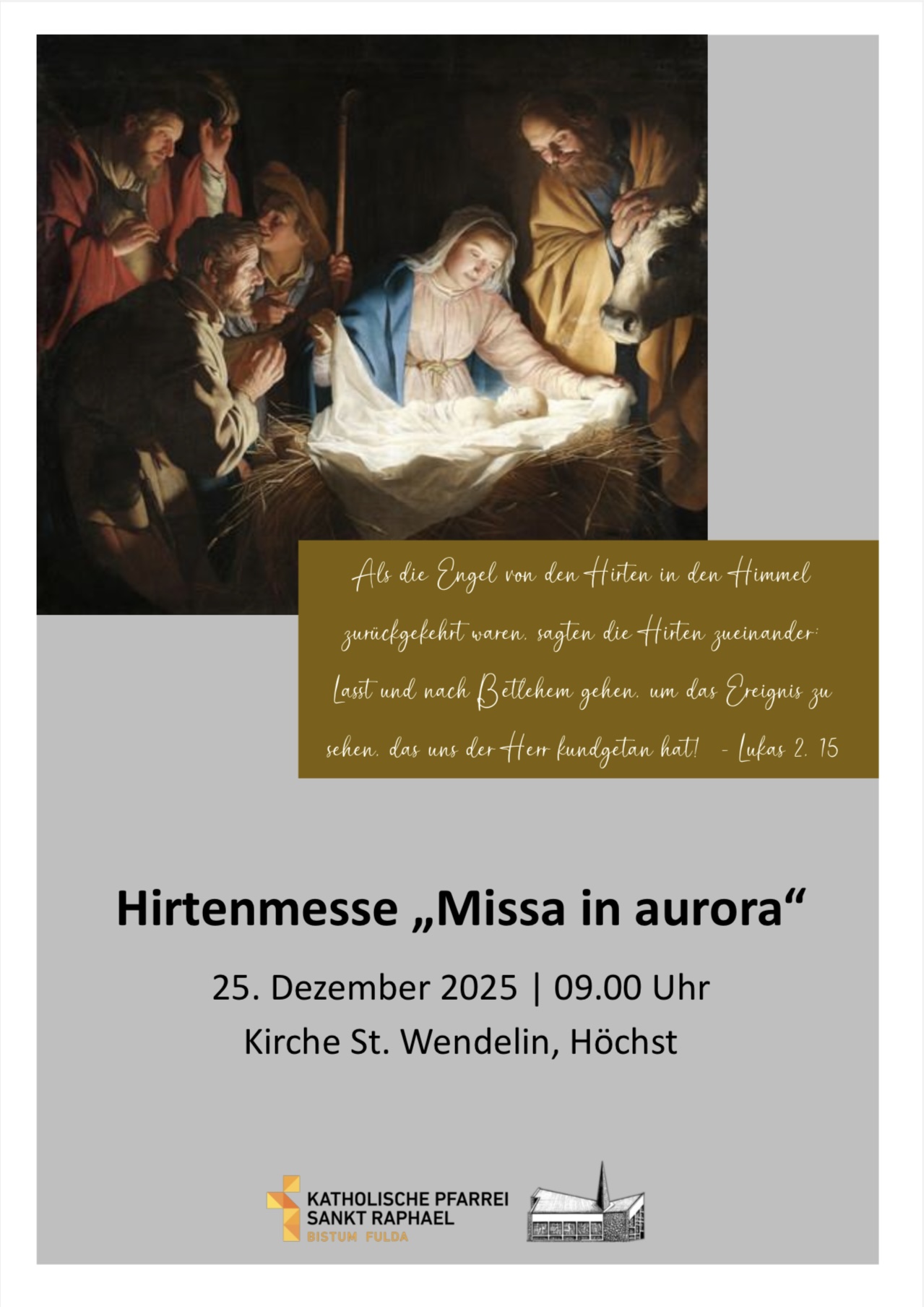 Herzliche Einladung zur Hirtenmesse am Weihnachtstag, der „Missa in aurora“, am Donnerstag, 25. Dezember 2025, um 9.00 Uhr in der Kirche St. Wendelin, Höchst.