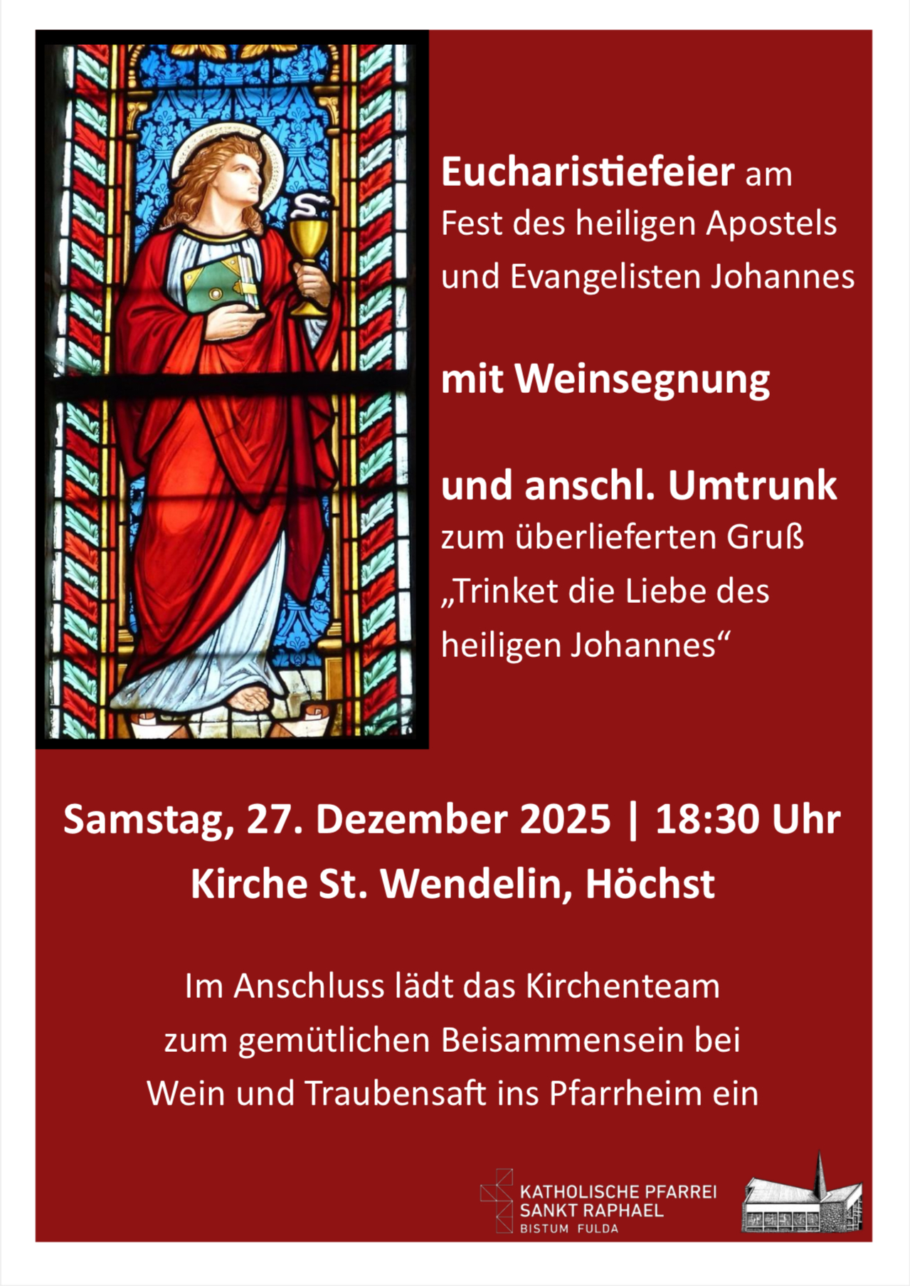 Am Samstag, 27. Dezember 2025, feiern wir um 18.30 Uhr in der Kirche St. Wendelin, Höchst, das Fest des heiligen Apostels und Evangelisten Johannes.