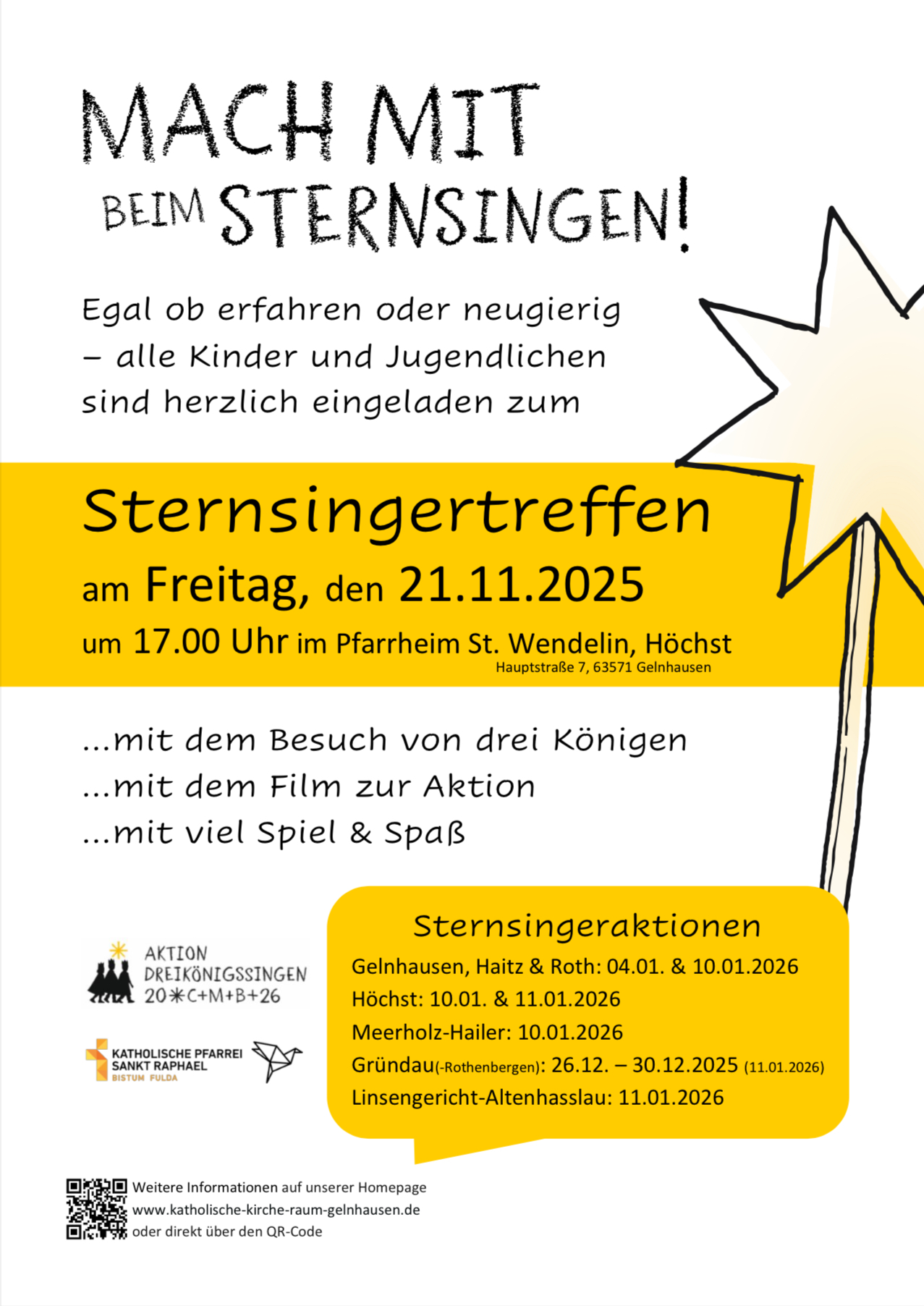 Unter diesem Motto laden wir herzlich ein zur Aussendungsmesse am Samstag, den 10. Januar 2026 um 18.30 Uhr, sowie zur Morgenandacht am Sonntag, den 11. Januar 2026 um 09.30 Uhr in die Kirche St. Wendelin, Höchst. Danach besuchen die Sternsinger die (auch in den Vorjahren) angemeldeten Haushalte. Anmeldungen für einen Hausbesuch sind bis zum 19. Dezember 2025 online auf unserer Homepage oder telefonisch im Pfarrbüro möglich.